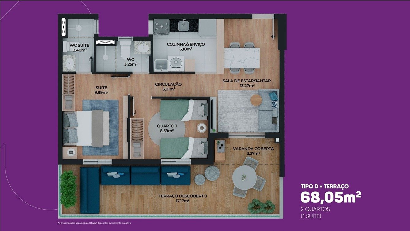 - Área privativa: Unidades a partir de 50,88m² (Planta tipo A) a 76,53m² (Planta tipo E+Terraço)