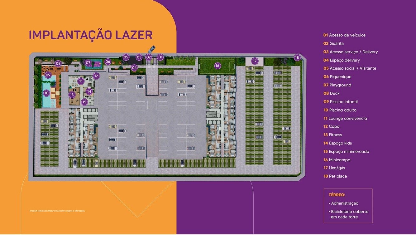 - Áreas de lazer: Piscina, deck duplo, lounge, playground, fitness, espaço kids, piquenique