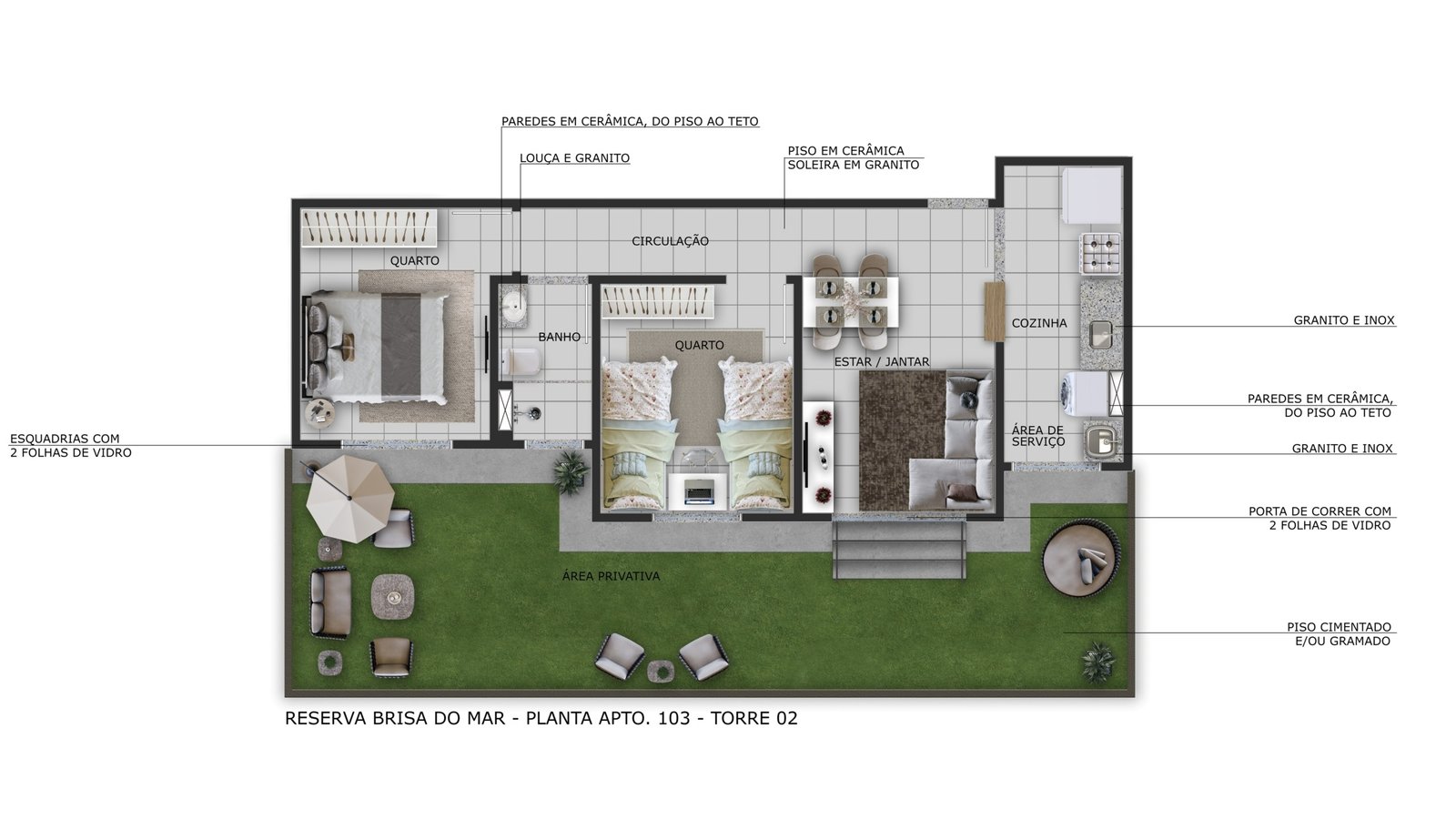 - 2 quartos (PCD) – Área total: 46,74 m2