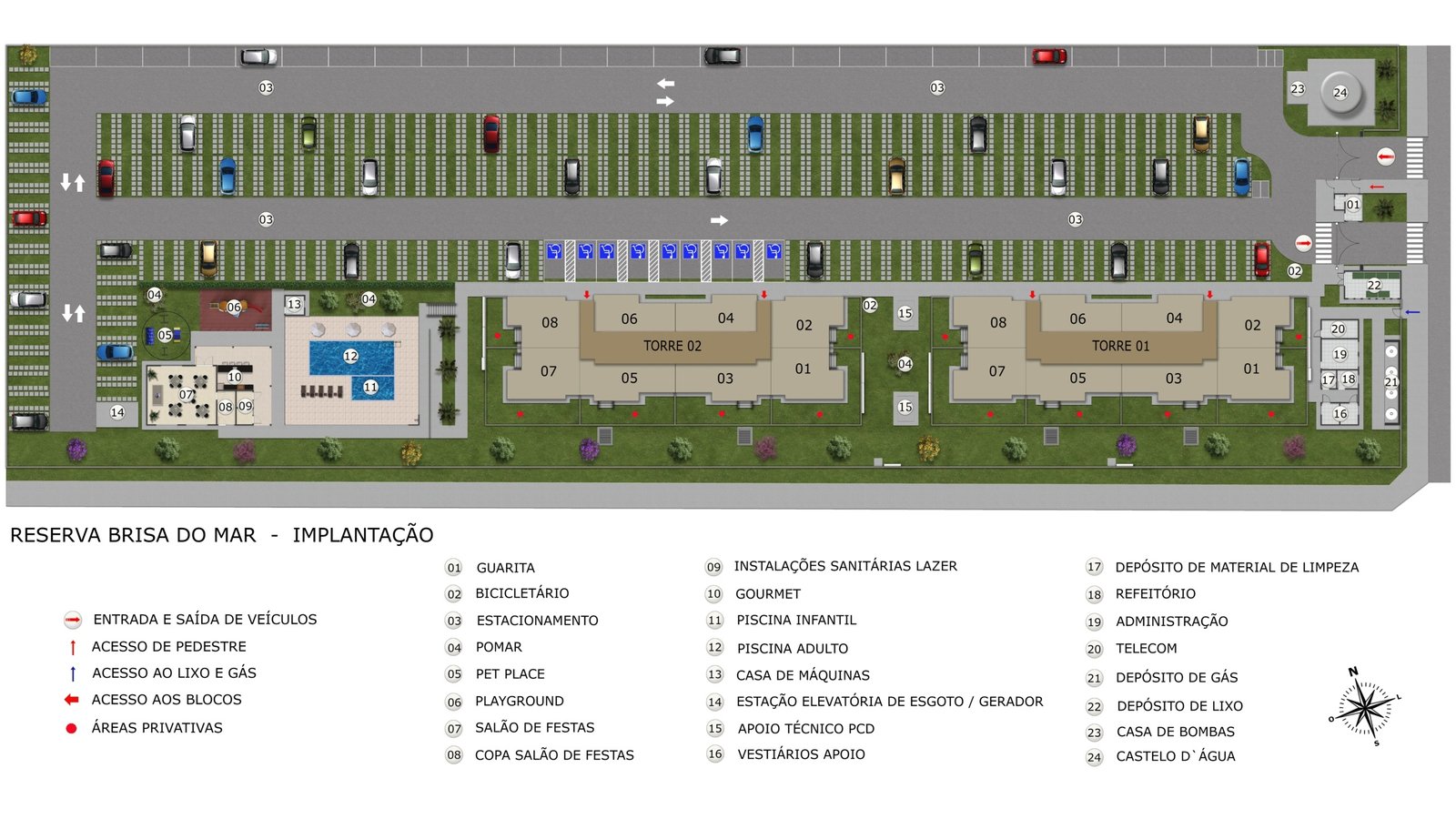 - Vagas de garagem: 223 no total, sendo 218 vagas para carros (209 vagas padrão e 9 para PCD) e 5 vagas para motos.