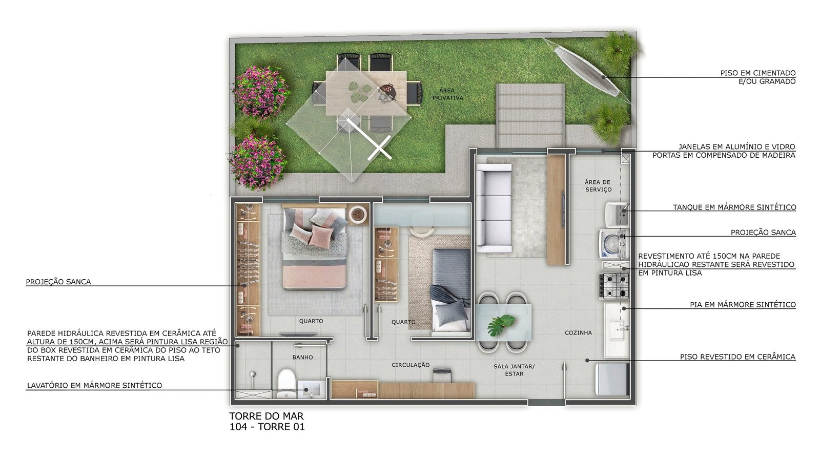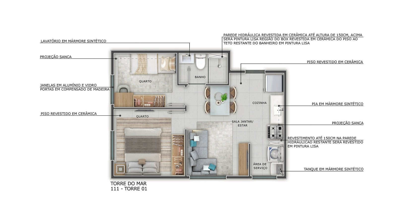 São apês de 2 quartos com opções de varanda e área privativa perfeitos para quem tem como estilo de vida conforto, bem-estar e exclusividade. Com uma área de lazer completíssima, com piscinas para adultos e crianças e um incrível espaço gourmet com churrasqueira para curtir com a família e os amigos, o Torre do Mar é o lugar perfeito para relaxar e se divertir.